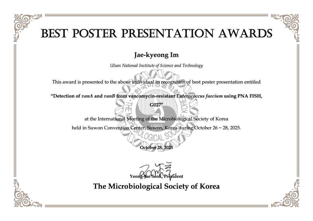 Jae-Kyeong’s best poster presentation award at the International Meeting of the Microbiological Society of Korea (Oct 2025)
